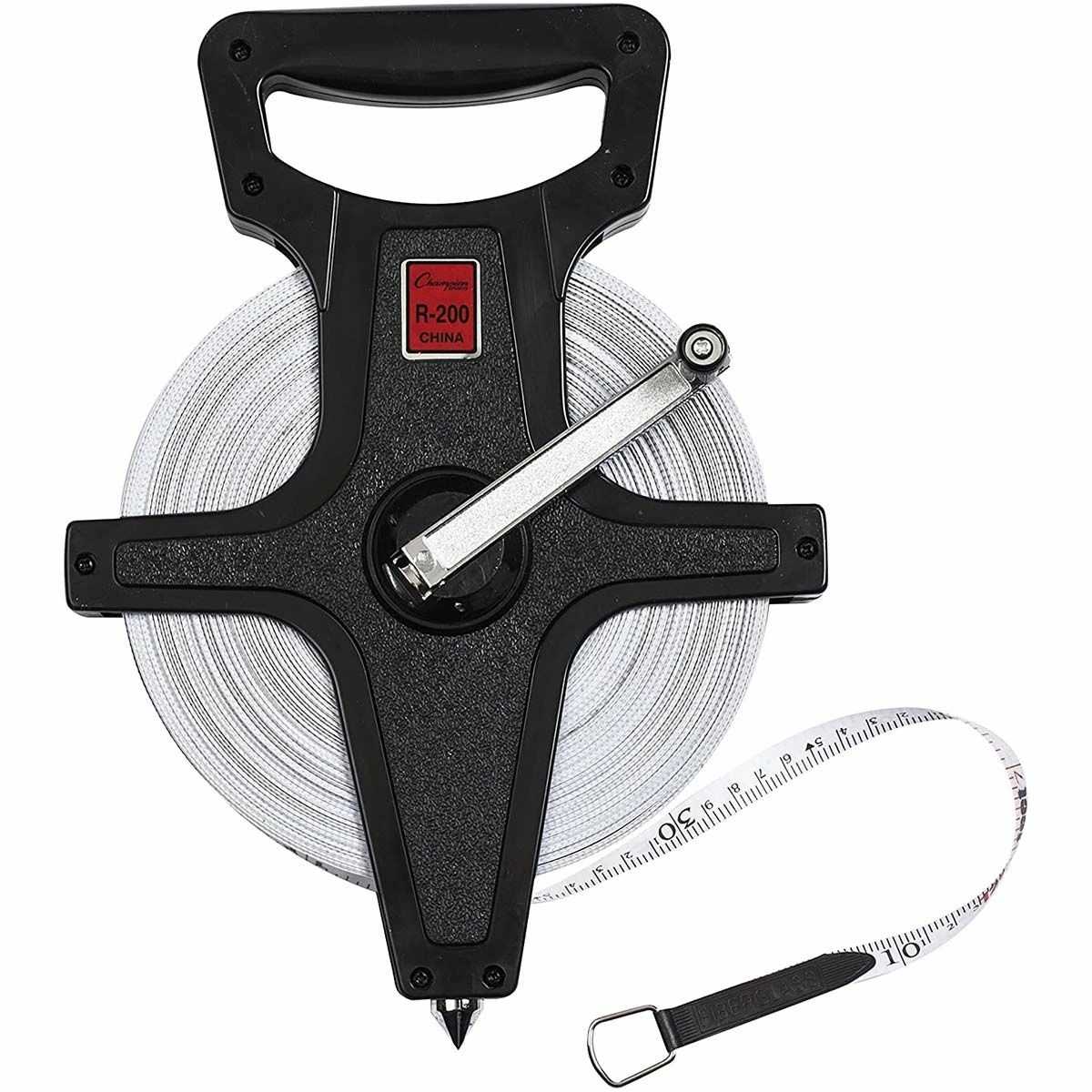 The open reel 200’/60M measuring tape has a durable fiberglass construction and is available in many sizes. Features an open reel design and a hand crank, which helps you easily wind the tape back into the roll. The bottom features a metal spike for added stability.