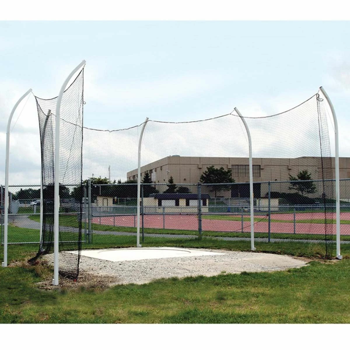 The Gill 8030 high school discus cage and net has the traditional six-pole layout and incorporates 14′ tall rolled steel offset poles. Steel flip arms secure the net at the front two poles with ground stakes used at the back poles. The new design allows the net to extend straight forward from the sides, while providing a less “restrictive” feeling for throwers.