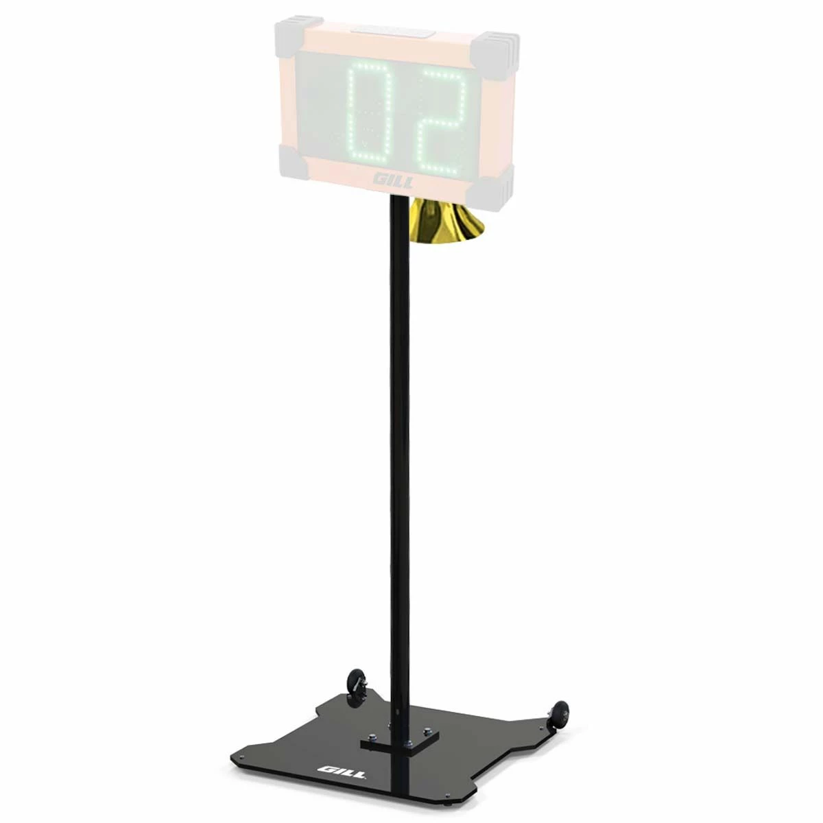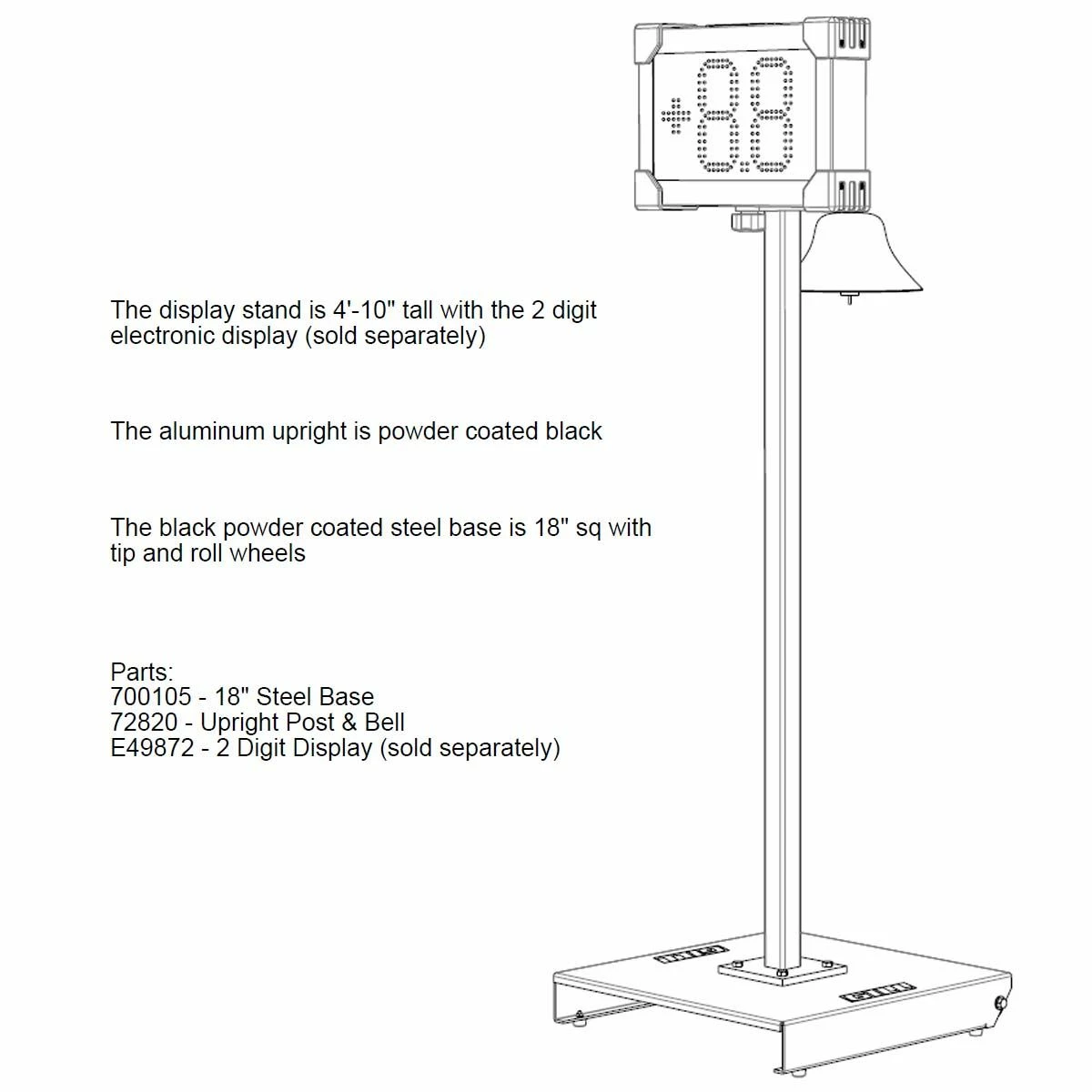This Gill Lap Counter Display Stand pairs with the Gill 2-Digit Electronic Display (sold separately) to form a lap counter. This stand includes a bell, and is perfect for any track and field activities that require a lap counter. The aluminum upright and steel base is powder coated black. The 18″ square base is equipped with tip and roll wheels for easy transport.
