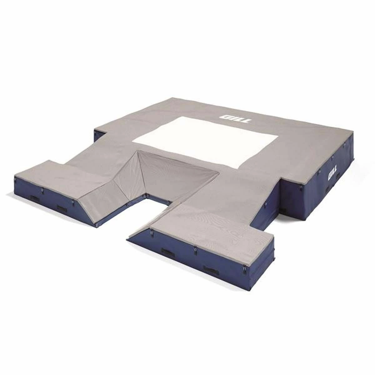The Gill G1 20′ x 21’11” x 32″ pole vault pit is equipped with an edge-to-edge top pad that is designed to eliminate spike contact with the base unit and unevenness at the edge of the pit. This innovative design improves athlete safety and increases the life of the pit. The 2″ duralife foam on the Gill G1 top pad is soft, comfortable and durable. The top pad is reversible and is connected to the base pads with carabiner side attachments that provide a safe, obstruction-free landing area for athletes. The Gill G1’s all vinyl base features a unique design that keeps water out of the pit. The base unit sections are also reversible for maximum interchangeability. The base unit’s quadruple duralife layer foam ensures a safe landing area. The G1 pole vault pit is available in over 100 vinyl casing and top pad color combinations. Multi-color graphics on the top pad and the weather cover (sold separately) are also available. The Gill G1 pole vault pit is backed by a 12 year warranty.