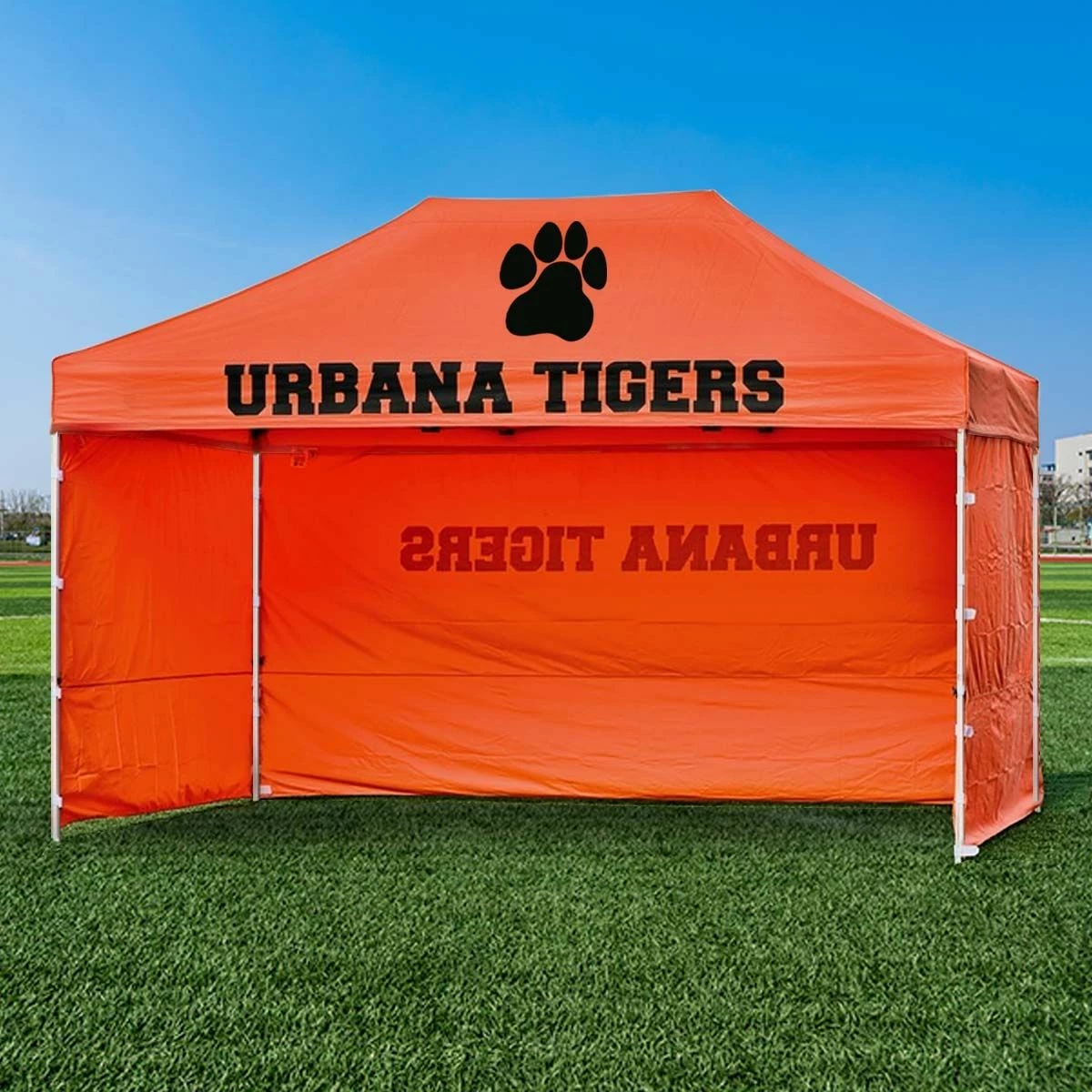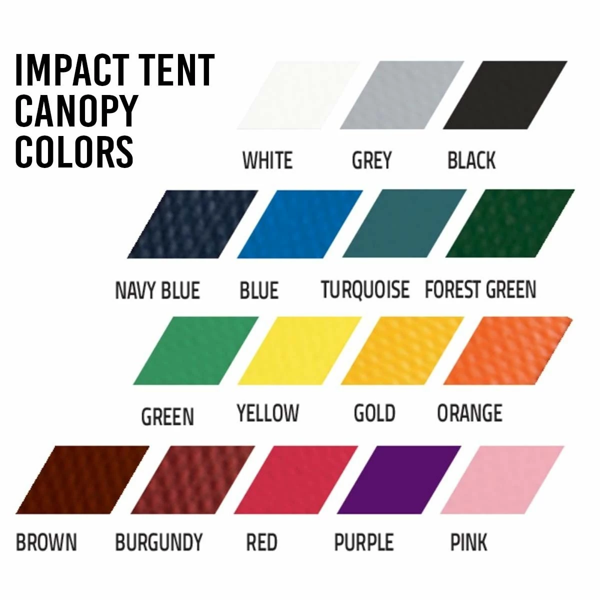 The impact tent canopy from Gill is available in 16 colors and 3 sizes: 10’x10′, 10’x15′, and 10’x20′. This canopy tent is water, UV light, and fire-resistant and includes a tent stake kit and dust cover bag. All sidewalls, roller bags, and graphics are sold separately. The commercial-grade steel frame and 500 denier polyester is tough enough to use your canopy tent outside until winds get to 10-15MPH. We advise you to take down the canopy once any rain or winds reach 10-15MPH as that will damage the structure.