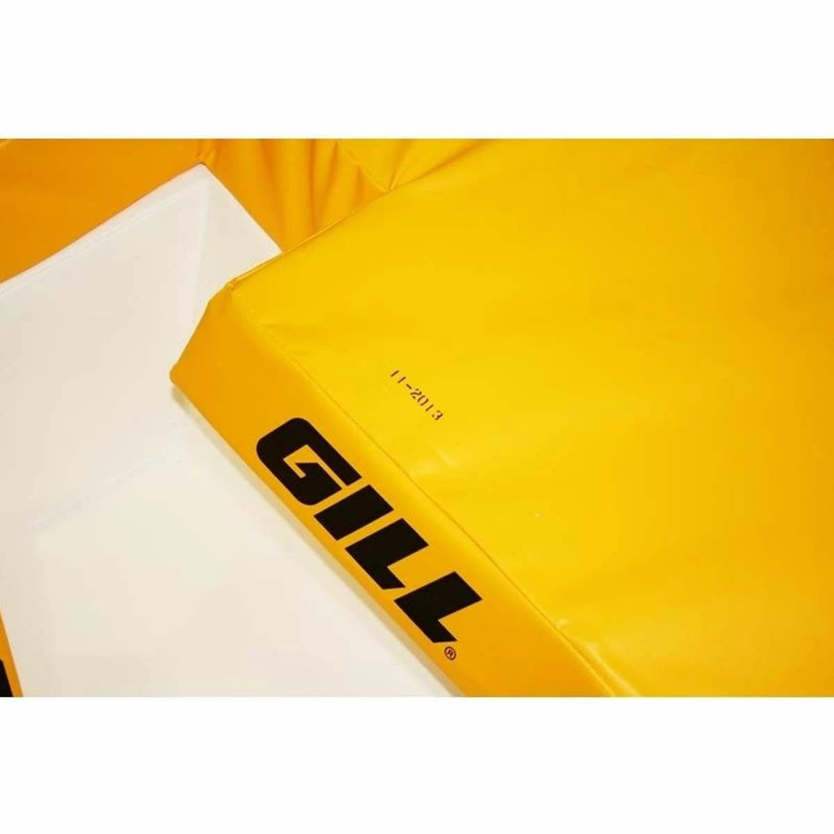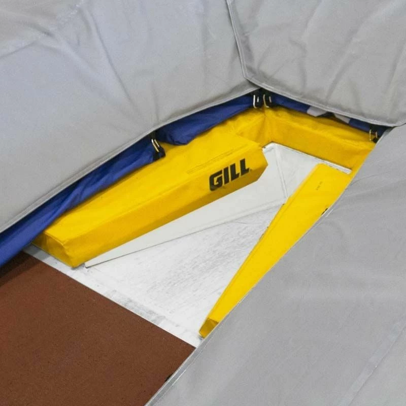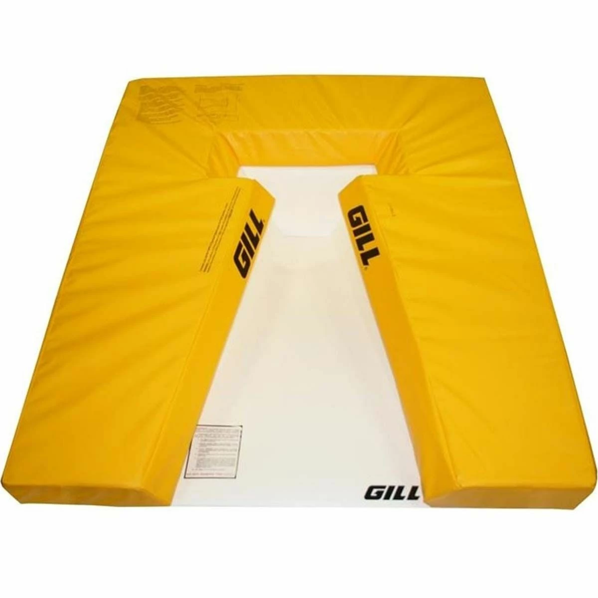 The SafetyMax+ vault box collar pad from Gill complies with ASTM standard F2949 and the 2013 rule mandated for NCAA competition and the 2015 rule mandated for NFHS competition. The SafetyMax+ will work with any style of pole vault landing system. The SafetyMax+ vault box collar provides additional safety and protection with better coverage and thicker padding than traditional vault box collar pads. The winged arms go down into the vault box so more of the hard surface is covered, however there is no interference with the pole action even at the highest levels of competition. In addition, the safety yellow color helps highlight the open area for planting the vaulting pole.Gill offers the only vault box collar pad with padded wings that extend down into the vault box.  (as required by ASTM Standard F2949). These “wings” are a patented feature that only Gill provides. (as of 10/1/14)