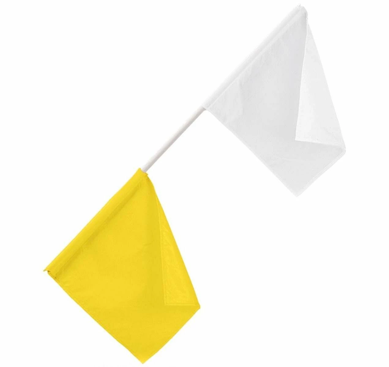 Officials’ flags are highly visible and made from heavy-duty nylon. Each flag is attached to a PVC dowel. The yellow flag is for violations in races and the white is for fair calls in both field events and races.