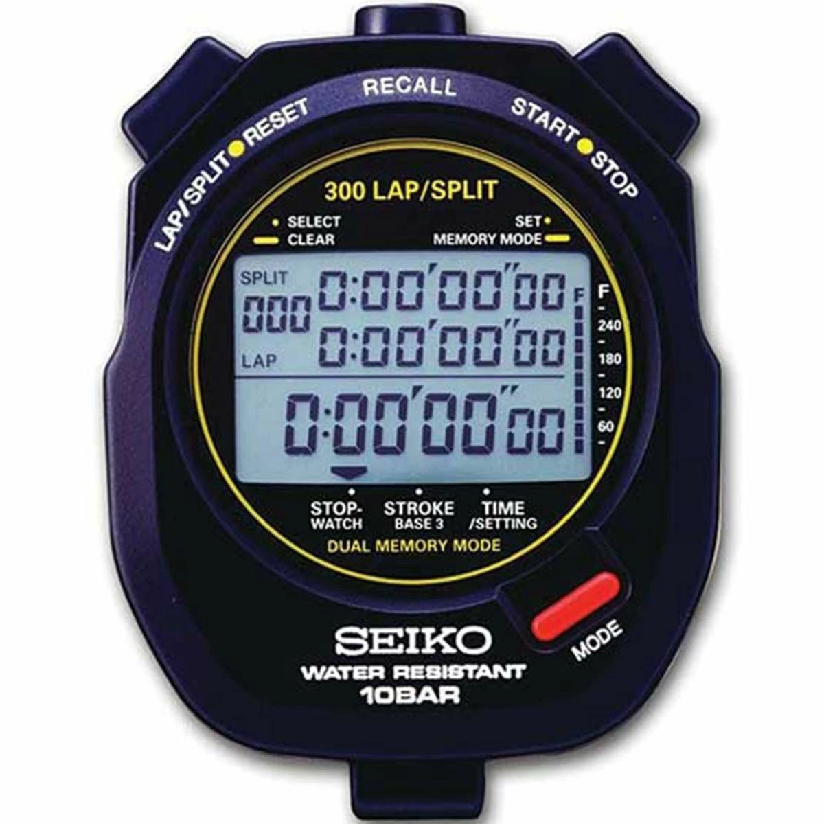 The Seiko S141 300 lap memory aquatic stopwatch is loaded with features including a dual memory mode, large-sized three row display and is measurable up to 10 hours in 1/100 of a second. This stop watch provides split/lap time measurement, stores and recalls up to 300 split/lap times and has memory recall during operation and memory overflow warning. Â Other features include a fastest lap time recall function, stokes per minute measurement, time and a full automatic calendar. The S141 includes an anti-bacterial case and lithium battery with battery life indicator.