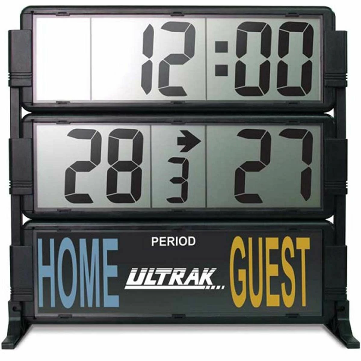 The Ultrak T-300 multi-sport scoreboard and timer scores for two teams up to a maximum score of 199 with large 4″ LCD digits that are visible for as far as 150 feet. This scoreboard provides the following options: set/point mode for match play; and count up or count down with a time range of 9 hours, 59 minutes and 59 seconds. The remote control is powered by either an AC adapter or four D size batteries. This scoreboard is free standing on floor or table, however, it can also be mounted on the wall.